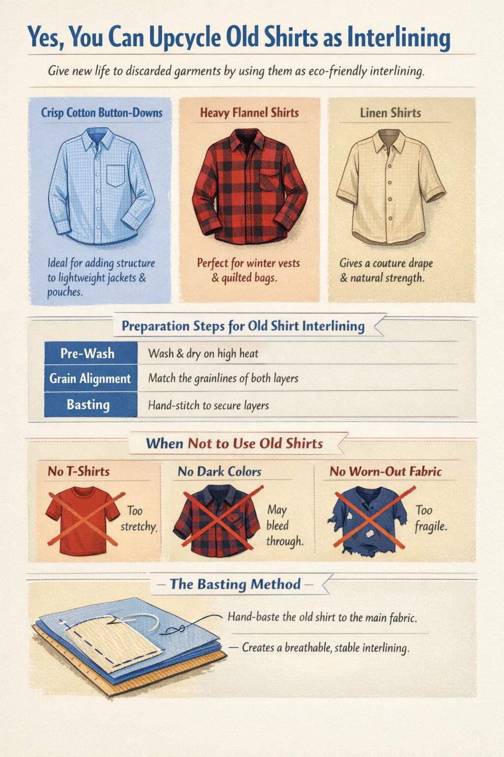 古いシャツを使用するときは、メイン生地の裏側に「しつけ」をする必要があります。これには、縫い目を保持するための長い一時的なステッチが含まれます。 芯地 最終の縫い目が縫い終わるまで、所定の位置に固定されます。この方法により、層がわずかに独立して動くことができるため、最新の接着剤の硬くてプラスチックのような感触に比べて、より快適で通気性のある衣服が作成されます。この従来のアプローチを選択すると、単にお金を節約できるだけではありません。あなたはよくいます 品質と寿命の向上 あなたの手作りアイテム。
