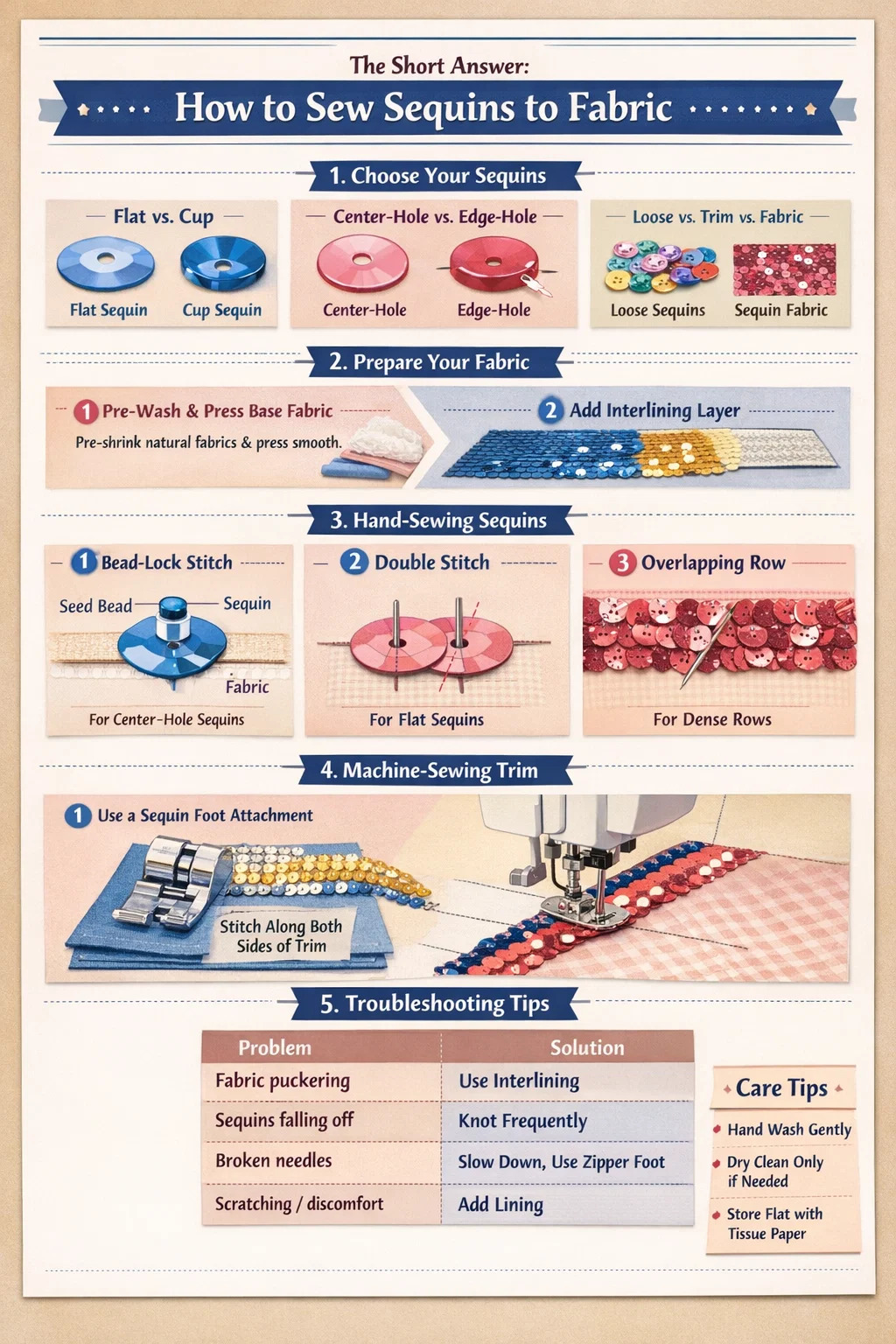 このガイドでは、適切なスパンコールの選択、生地と芯地の準備、個々のピースの手縫い、機械によるスパンコールのトリムの適用、一般的な問題のトラブルシューティング、完成したプロジェクトの手入れなど、すべての段階を説明します。特定のステッチ数、糸の種類、芯地重量が含まれているため、手作りではなくプロのような仕上がりが得られます。