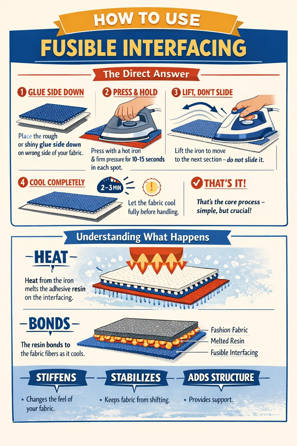 多くのプロジェクトが失敗するのはここです。冷たすぎると樹脂が溶けて接着できなくなります。熱すぎると、繊細な生地が焦げたり、合成繊維が変形したり、接着芯が過剰に融着して脆くなったりします。まずインターフェイスの製造元の指示に従ってから、お使いの生地の種類と相互参照してください。