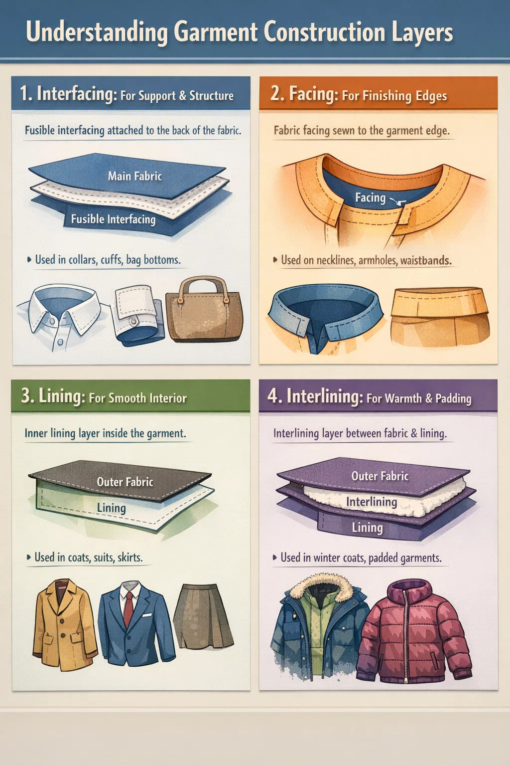 使用場所: 冬のコートをより暖かくしたい場合は、間にウールまたは綿の中綿の層を追加できます。外側の生地が薄すぎて中身が足りないと思われる場合は、厚みとドレープ性を高めるために芯地を追加することもできます。
